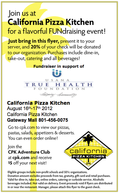Print off this flyer (PDF) and make your way down to the California Pizza Kitchen, conveniently located behind the Energy Solutions Arena, for some great food and to help raise money!
