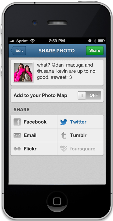 Share — When you’re done editing your image, you’re ready to share. Tap the next button at the top of the screen. You’ll see a bunch of fields that are pretty self-explanatory.