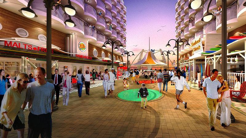 This is located mid-ship and is literally a park on the Allure. It has all real plants, and you can hear birds singing and crickets chirping. There are benches where you can just sit and watch the people walk by… you feel as though you are really in New York’s Central Park. The park is open air so that you can see the stars at night, and it’s beautiful! This is also where some of the signature restaurants are located.