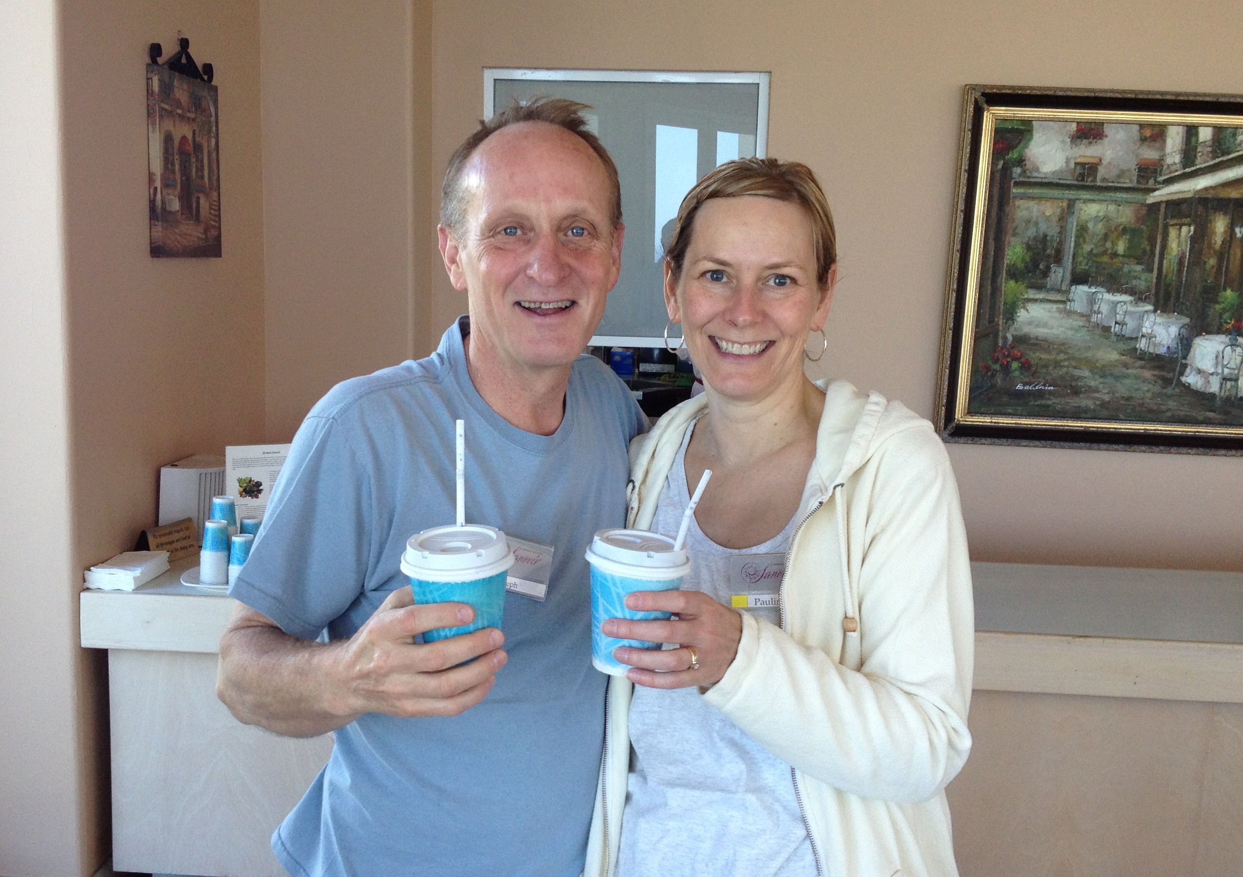 Top male percentage weight-loss winner Joseph Vandervelden and his wife Pauline enjoy a tasty paleo-shake during an all-liquid cleanse day.