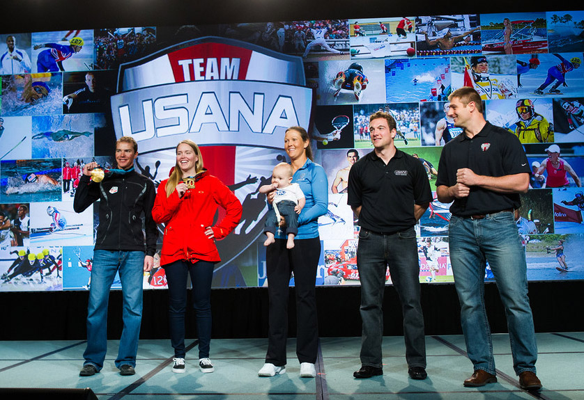 Team USANA athletes Billy Demong, left, Grete Eliassen, Liezel Huber, Mike Lee and Andy Studebaker share the stage at the Chicago XRC.
