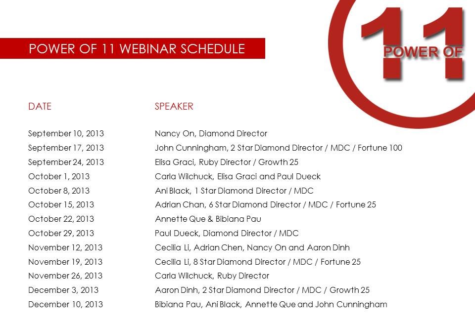 Beginning today (Sept. 10) and running through Dec. 10, the Power of 11 mentors will be sharing their stories and lessons with Associates via weekly webinars. From learning how to deal with rejections, to escaping the corporate rat race, valuable experiences and lessons will be related in hopes to help others through some of their obstacles. These webinars are a great place to invite guests and teammates to help grow your USANA business. Tune in every Tuesday at 6 p.m. PDT.