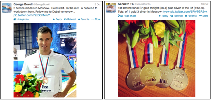George Bovell (T&T) secured two bronze medals in the 50m free and 100 medley at the FINA Swimming World Cup in Moscow, while Kenneth To (AUS) secured gold in the 100m breast and three silver medals in the 100 free, 100 medley and 200 medley. The two Olympians are now headed to Dubai for the next World Cup event.
