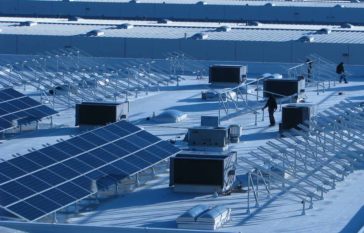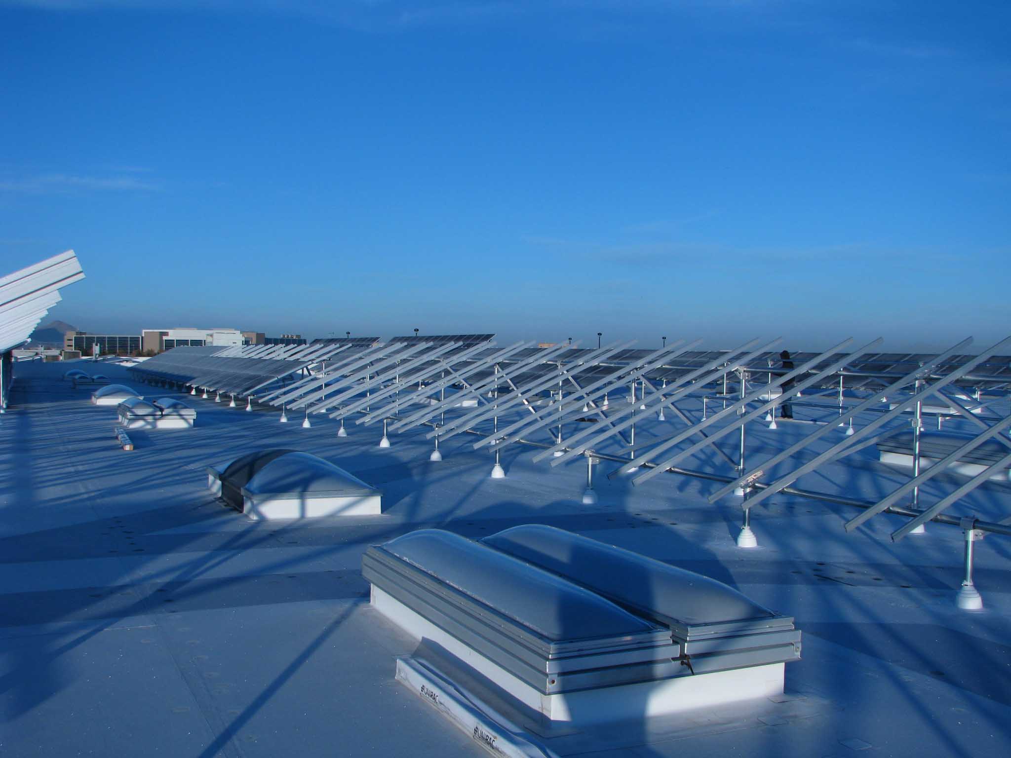 Workers install solar panel components on USANA’s rooftop during Phase 3 of USANA’s solar energy system.