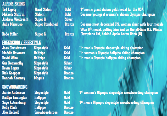 - The U.S. Ski and Snowboard Association scored 17 medals (record 8 gold, 3 silver and 6 bronze) during the Games, including historical gold for both men and women, in the inaugural ski halfpipe and slopestyle snowboarding events!