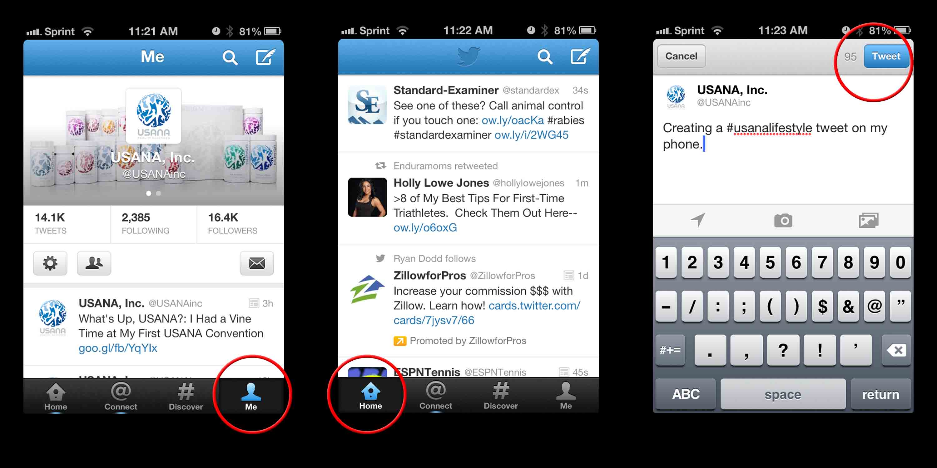 Moi : Cette icône vous mène à votre profil (ci-dessus, une photo de celui d’USANAinc). Quand vous envoyez un lien vers votre profil à quelqu’un, c’est ici que ce lien le conduit.