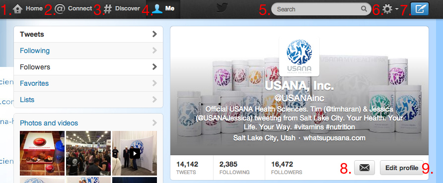 Hashtag (#) : une manière d’indiquer un sujet de conversation ou de participer à un débat plus large (par exemple : #USANA13, #USANAlifestyle). Un hashtag devient automatiquement un lien à une recherche de ce terme. Vous pouvez cliquer sur un hashtag pour voir tous les tweets qui le mentionnent en temps réel, même ceux écrits par des gens que vous ne suivez pas.