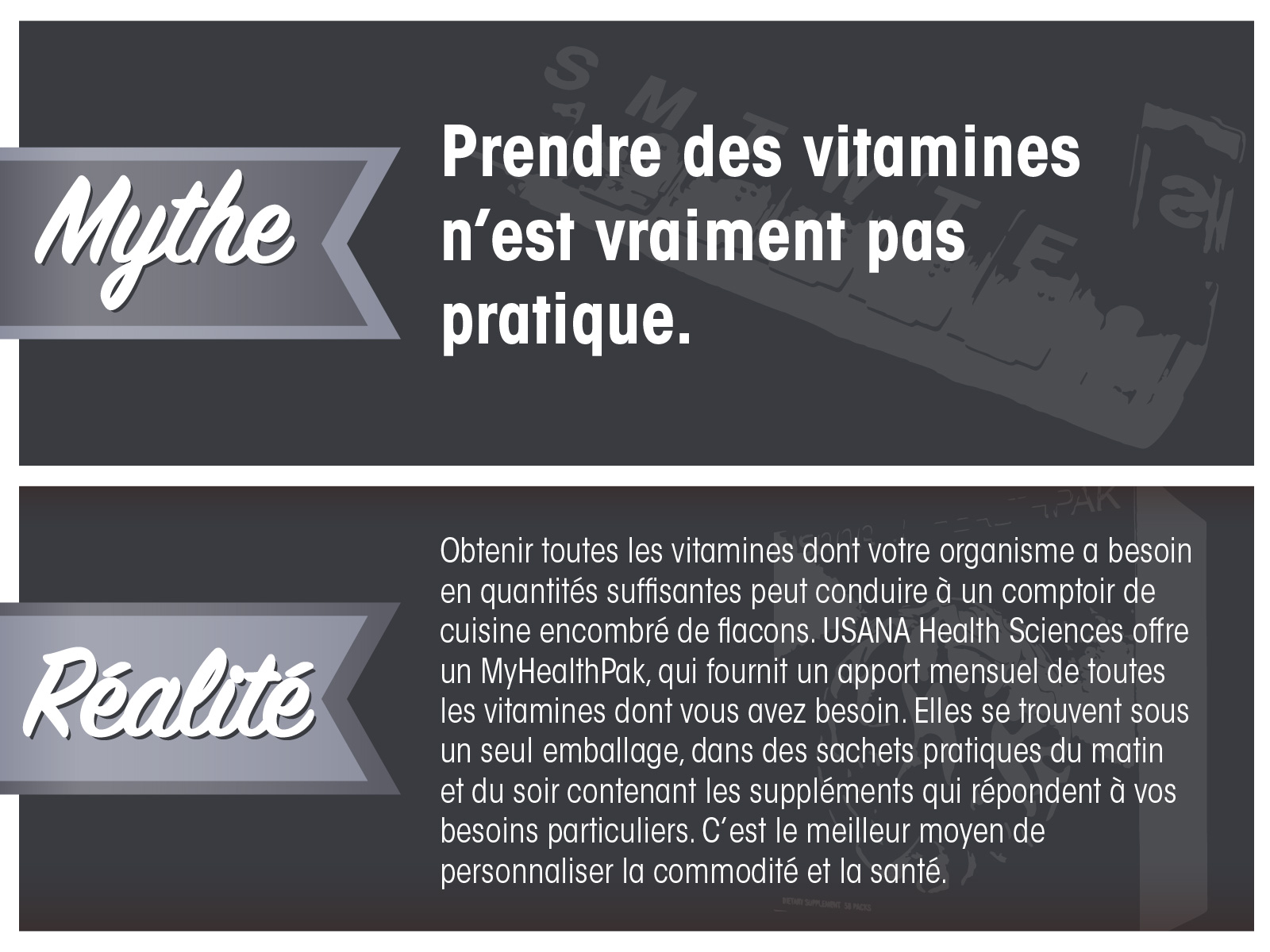 USANA Health Sciences a développé ce qui s’appelle l’Évaluation de la santé véritable. Cet outil révolutionnaire en ligne vous permet de découvrir vos propres besoins en vitamines. Et une fois cela établi, les vitamines recommandées peuvent être partagées en sachets pratiques du matin et du soir.