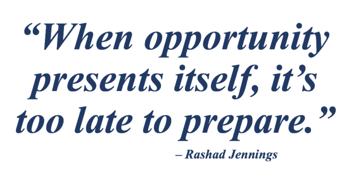 And while he will be the first to admit that his bad attitude wasn’t helping him get the playing time he wanted. It wasn’t until a football scout saw potential in him that Jennings started to take ownership. He focused on his nutrition, education, and athletic dreams his senior year of high school. Senior year he charged forward with a new motto: when opportunity presents itself, it’s too late to prepare for it. And prepare is what he did.