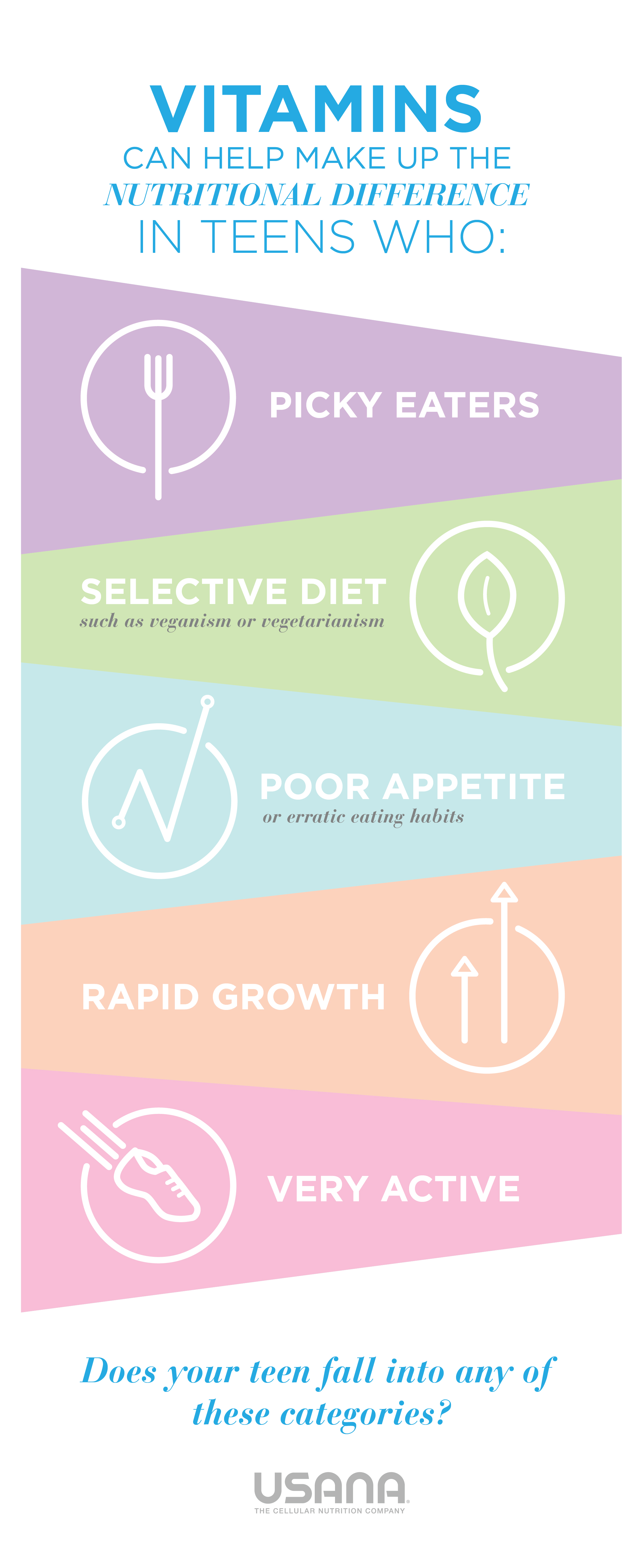 This is where vitamins for teens come in. A vitamin tuned specifically for the needs of teenagers can help pick up the slack when their diet falls short. Specifically, vitamins can help make up the nutritional difference in teens who: