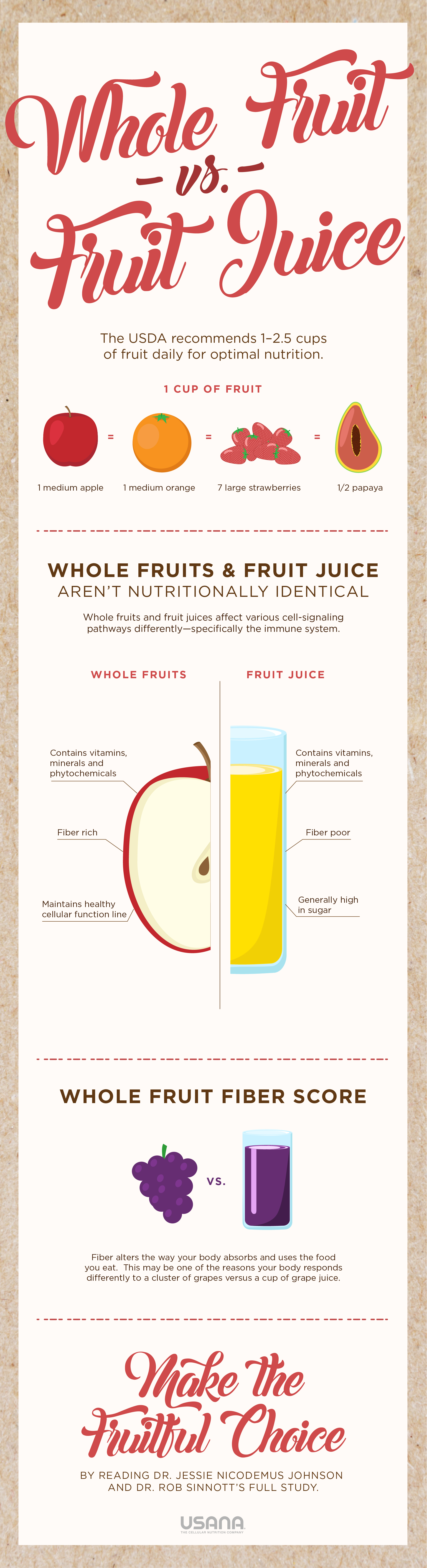 We all know the saying, “an apple a day keeps the doctor away” and a study led by USANA scientist, Dr. Jessie Nicodemus Johnson, shows why it’s a good idea to heed that advice. The study shows that eating whole fruit provides different benefits to the body versus drinking fruit juice. Although juice consumption may help with vitamin and mineral absorption, the immune system pathways associated with juice consumption are different than that of the humble whole fruit consumer, likely because the fiber in whole fruit is regulating what and when different compounds that are consumed are taken into the body.