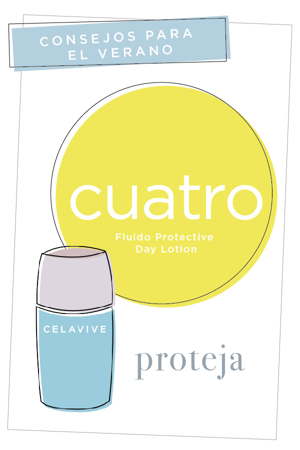 Consejo 4: Su rutina de maquillaje para el verano debe concentrarse en que la cobertura sea ligera.  Los productos humectantes pesados y cremosos pueden llegar a mezclarse con el sudor y con otros aceites de la piel, tapando sus poros.  Mezcle su humectante favorito—yo recomiendo el fluido Protective Day Lotion—con su primer facial usual para crear el bálsamo de belleza ideal y combatir los rayos UVB al tiempo que logra una cobertura más ligera.