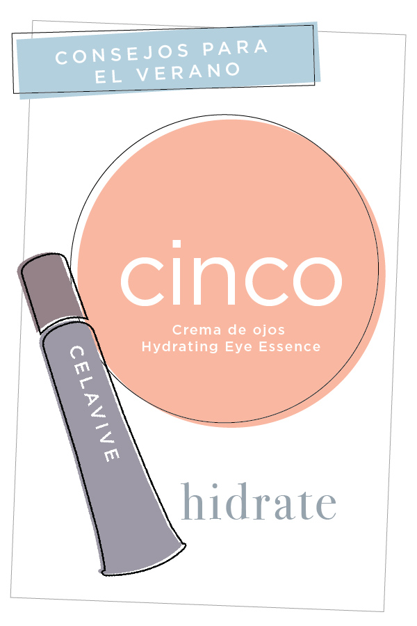 Consejo 5: La delicada piel que está alrededor de sus ojos es sensible a la luz solar.  Para refrescar sus ojos fácilmente, coloque su crema para ojos Hydrating Eye Essence en el refrigerador durante 30 minutos. Aplíquela bajo sus ojos, como lo hace usualmente, y también aplíquela dando un masaje en la parte superior de los párpados.  Sus ojos se verán desinflamados, y la esencia es una fabulosa base para aplicar después la sombra de ojos.