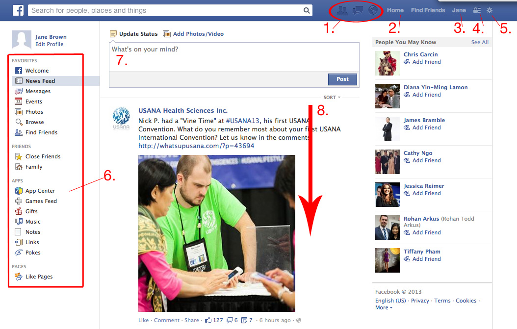 - News Feed: This is where public messages (updates) from your friends appear. If you “Like” a page, its updates will appear here as well. This gives you a quick look at what your friends have been doing on Facebook.