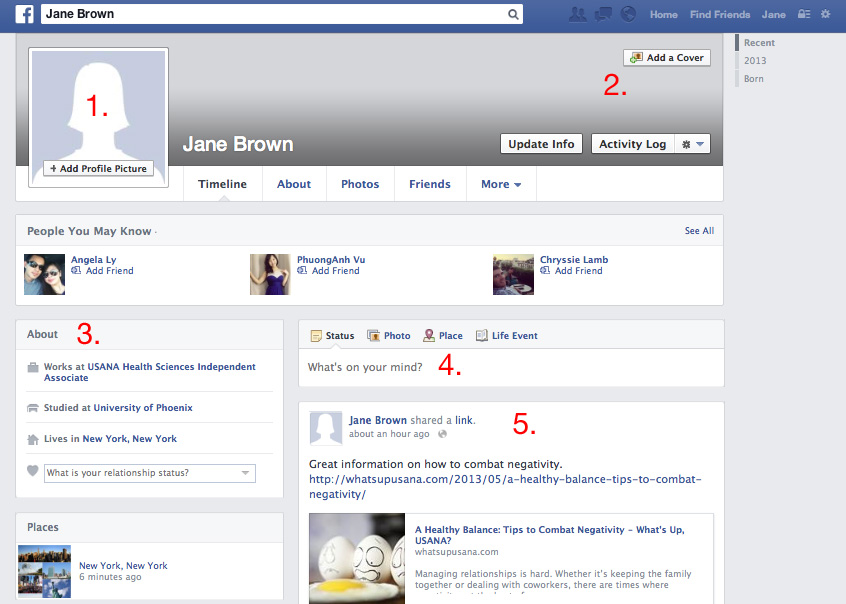 - Profile Picture: This image represents you whenever you post anything on Facebook. You can change your picture any time by hovering your mouse over the photo and then clicking “edit profile picture.”