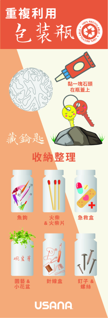 只要簡單地在網上搜尋,就會有上千種重新利用塑料瓶的方法,以下是我們最喜愛的重複利用 USANA 瓶子的妙招: